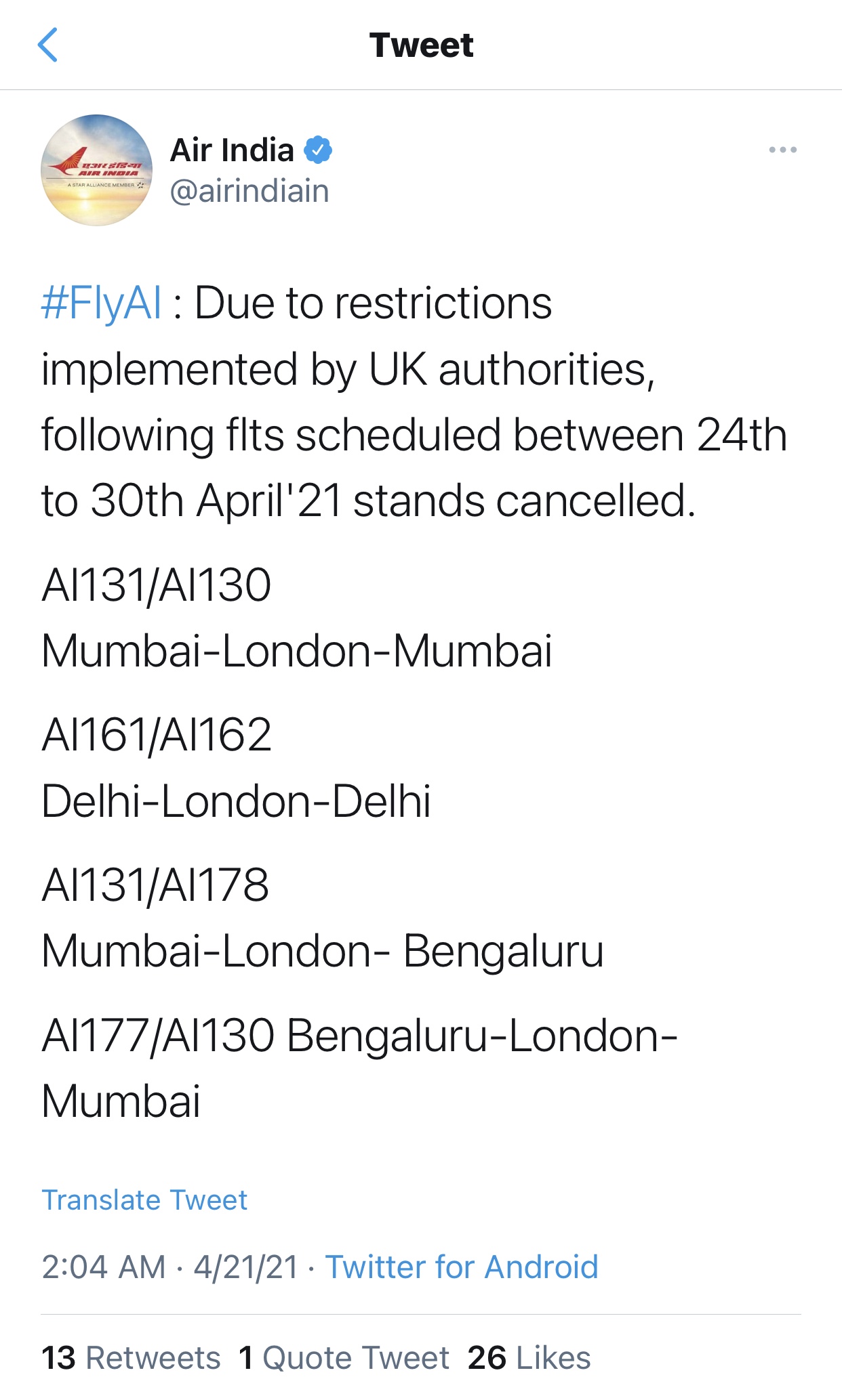 Air India also posted that “Passengers who were to travel between India and UK, may kindly note that in view of recent restrictions announced by UK, flts from/to UK stand cancelled from 24th to 30th April ’21. Further updates regarding rescheduling, refunds & waivers will be informed shortly.”