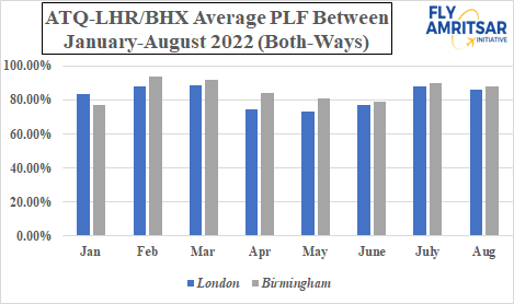 As per the traffic data released by the UK Civil Aviation Authority (UK CAA), between January-August 2022, Air India has experienced an great average Passenger Load Factor (PLF) on both routes to London Heathrow and Birmingham from Amritsar.