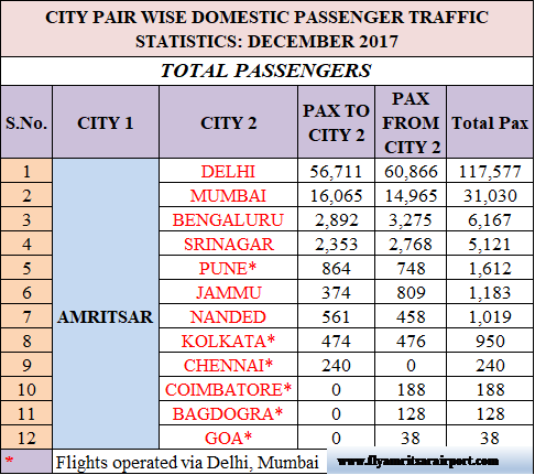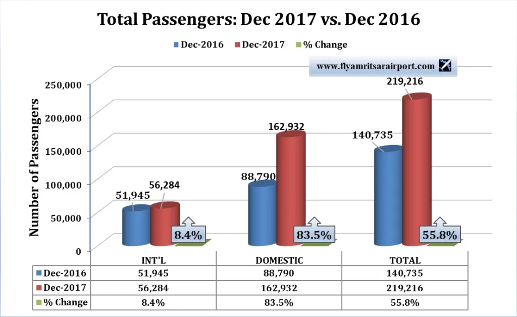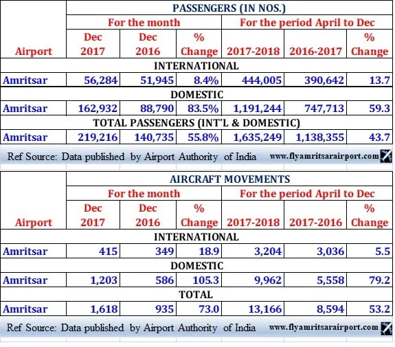 Shri Guru Ram Das Jee (SGRDJ) International Airport, Amritsar has beaten all the other international airports in the country in Dec 2017 with highest domestic passenger growth of 83.5% and aircraft movement increase of 103.5% in comparison to the same month in 2016. Footfall of domestic passengers in Dec 2017 reached 1,62,932 in comparison to 88,790 during the corresponding month in 2016. This number is also higher than previous month in November 2017 total of 160,150 passengers. Traffic between Amritsar-Delhi and Amritsar-Mumbai top the list with 117,577 and 31,030 passengers.
