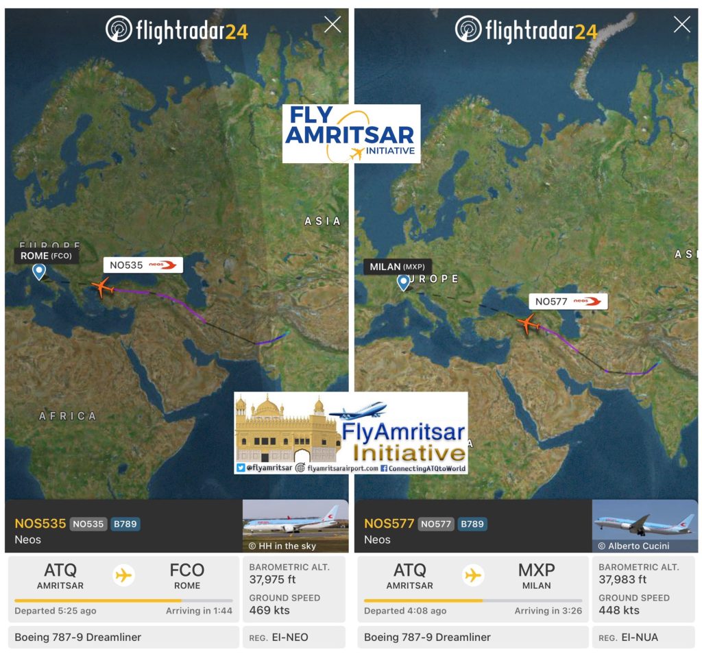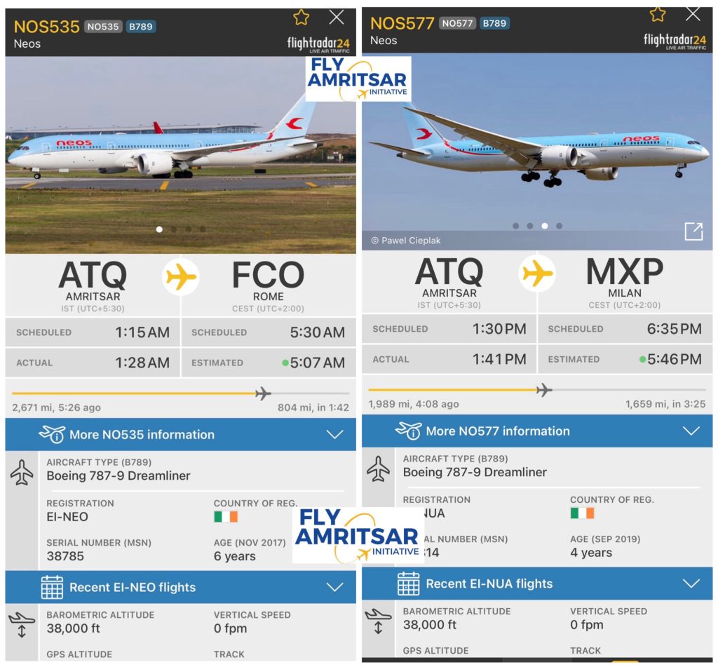 ਅੱਜ ਇਟਲੀ ਦੀ ਨਿਓਸ ਏਅਰ ਦੇ ਦੋ ਬੋਇੰਗ ਡ੍ਰੀਮਲਾਈਨਰ ਇਟਲੀ ਤੋਂ ਅੰਮ੍ਰਿਤਸਰ ਪਹੁੰਚੇ ਅਤੇ ਫਿਰ ਮਿਲਾਨ ਅਤੇ #ਰੋਮ ਲਈ ਰਵਾਨਾ ਹੋਏ। ਇਹਨਾਂ ਦੋ ਮੰਜ਼ਿਲਾਂ ਤੋਂ ਇਲਾਵਾ, ਨਿਓਸ ਅੰਮ੍ਰਿਤਸਰ ਨੂੰ ਮਿਲਾਨ ਰਾਹੀਂ #ਟੋਰਾਂਟੋ ਨਾਲ ਵੀ ਜੋੜਦੀ ਹੈ, ਸਿਰਫ 2 ਤੋਂ 3 ਘੰਟਿਆਂ ਦਾ ਸੁਵਿਧਾਜਨਕ ਇੰਤਜ਼ਾਰ ਕਰਨਾ ਪੈਂਦਾ ਹੈ।