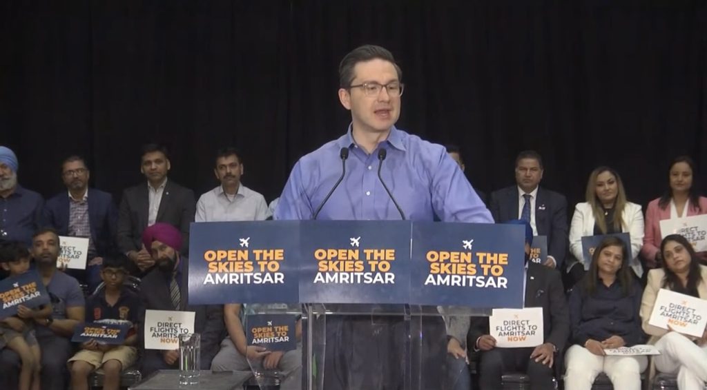 ਬੀਤੇ ਦਿਨੀਂ ਕੰਜ਼ਰਵੇਟਿਵ ਪਾਰਟੀ ਦੇ ਨੇਤਾ ਪੋਇਲੀਵਰ ਨੇ ਓਨਟਾਰੀਓ ਸੂਬੇ ਦੇ ਸ਼ਹਿਰ ਬਰੈਂਪਟਨ ਵਿੱਚ ਆਪਣੀ ਪਾਰਟੀ ਵਲੋਂ ਕਰਵਾਏ ਗਏ ਇੱਕ ਭਰਵੇਂ ਸਮਾਗਮ ਵਿੱਚ ਕੈਨੇਡਾ ਦੀ ਮੌਜੂਦਾ ਸਰਕਾਰ ‘ਤੇ ਨਿਸ਼ਾਨਾਂ ਸਾਧਦਿਆਂ ਕਿਹਾ ਕਿ ਪੰਜਾਰੀ ਭਾਈਚਾਰਾ ਲੰਮੇ ਸਮੇਂ ਤੋਂ ਕੈਨੇਡਾ ਅਤੇ ਅੰਮ੍ਰਿਤਸਰ ਦਰਮਿਆਨ ਸਿੱਧੀਆਂ ਉਡਾਣਾਂ ਸ਼ੁਰੂ ਕਰਨ ਵਿੱਚ ਸਰਕਾਰ ਵਲੌਂ ਸਹੂਲਤ ਕਰਨ ਦੀ ਮੰਗ ਕਰ ਰਿਹਾ ਹੈ। ਪਰ ਕਈ ਸਾਲਾਂ ਬਾਅਦ ਵੀ, ਲਿਬਰਲ ਸਰਕਾਰ ਇਸ ਮੰਗ ਨੂੰ ਪੂਰਾ ਕਰਨ ਵਿੱਚ ਅਸਫਲ ਰਹੀ ਹੈ।