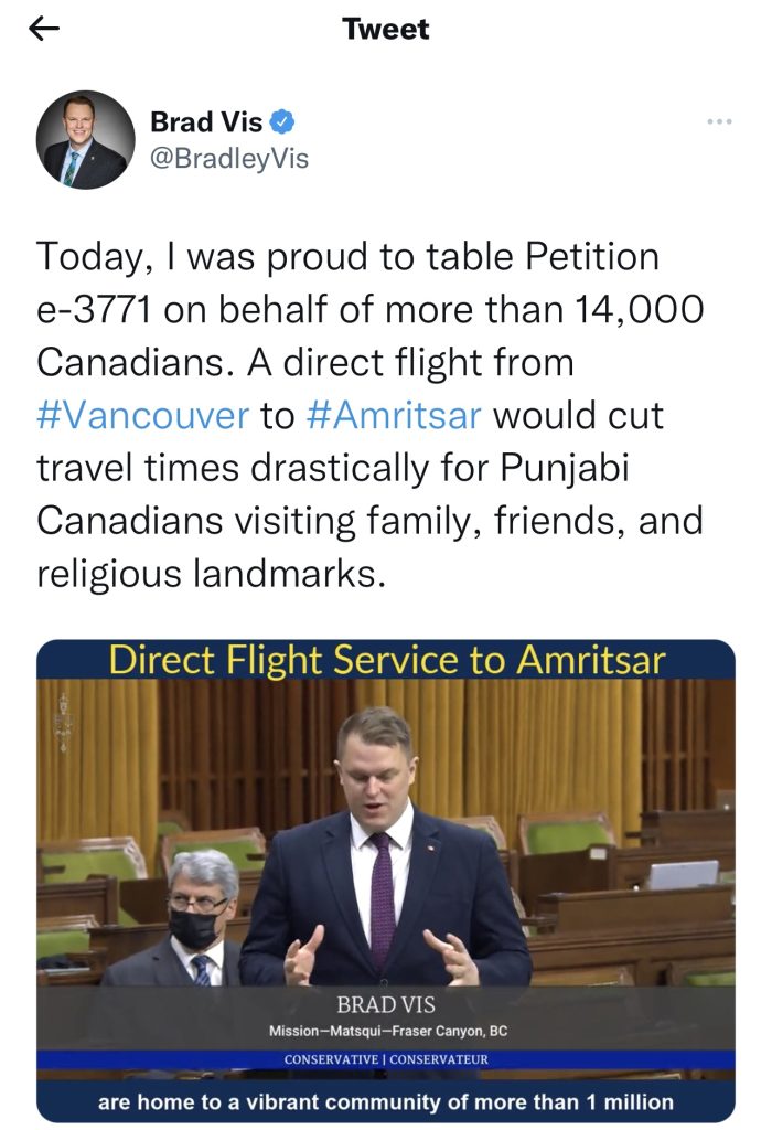 March 7, 2022:  FlyAmritsar Initiative, a civil society global initiative for connecting Amritsar airport to destinations around the World, has expressed gratitude to Canadian Member of Parliament Brad Vis (representing Mission-Matsqui-Fraser Canyon in British Columbia) and Shadow Minister for Pacific Economic Development for tabling a petition in the Canadian parliament requesting the Government to proactively advocate for direct flights between Vancouver/Toronto to Amritsar in India.