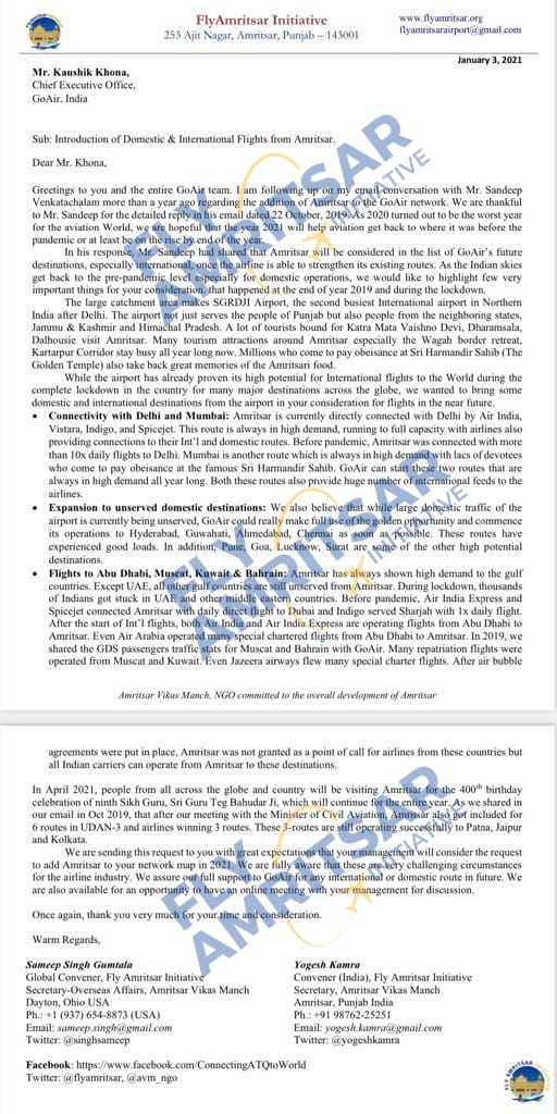 In a press release, Yogesh Kamra, Convener India for the FlyAmritsar Initiative and Manmohan Singh Brar, Patron Amritsar Vikas Manch thanked the airline and said that the introduction of these Go First flights from Amritsar adds another success to our efforts for the start of more direct flights from holy city, as Go First is now set to become the 6th Indian carrier to operate out of Amritsar Airport. In early January 2021, we approached the airline CEO and network team with detailed statistics, requesting them to commence domestic and international flight operations from Amritsar.