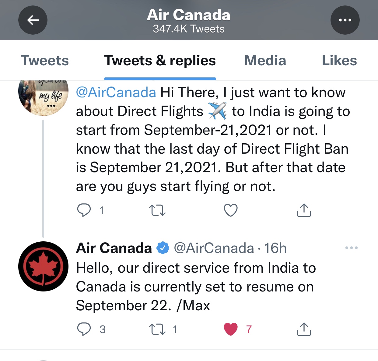 ਏਅਰ ਕੈਨੇਡਾ ਨੇ ਟਵੀਟਰ ‘ਤੇ 22 ਸਤੰਬਰ 2021 ਤੋਂ ਭਾਰਤ ਤੋਂ ਕੈਨੇਡਾ ਲਈ ਆਪਣੀਆਂ ਸਿੱਧੀਆਂ ਉਡਾਣਾਂ ਸ਼ੁਰੂ ਕਰਨ ਦੀ ਪੁਸ਼ਟੀ ਕੀਤੀ ਹੈ, ਪਰ ਕੈਨੇਡਾ ਦੀ ਫੈਡਰਲ ਸਰਕਾਰ ਨੇ ਇਸ ਬਾਰੇ ਅਜੇ ਕੋਈ ਐਲਾਨ ਨਹੀਂ ਕੀਤਾ ਹੈ ਕਿ 21 ਸਤੰਬਰ ਤੱਕ ਸਿੱਧੀਆਂ ਉਡਾਣਾਂ ਤੇ ਲਗਾਈ ਪਾਬੰਦੀ ਨੂੰ ਇਸ ਤਰੀਕ ਤੋਂ ਬਾਦ ਹਟਾ ਦਿੱਤਾ ਜਾਵੇਗਾ ਜਾਂ ਨਹੀਂ।