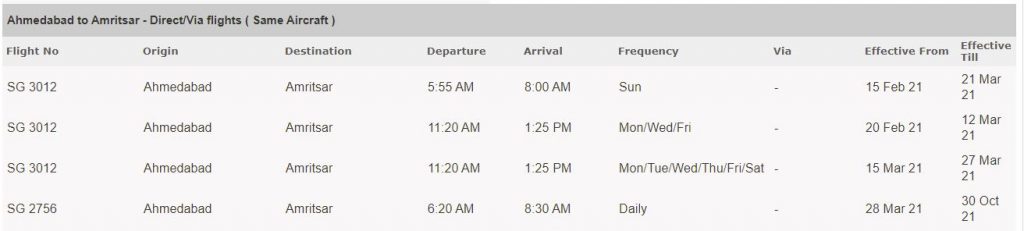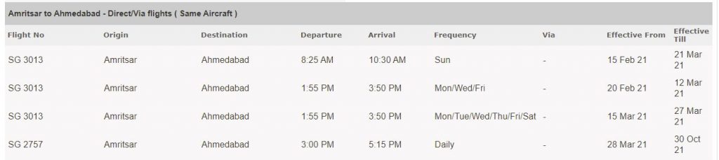 ਭਾਰਤ ਦੀ ਪ੍ਰਾਈਵੇਟ ਏਅਰਲਾਈਨ ਸਪਾਈਸਜੈੱਟ ਦੀ ਅੰਮ੍ਰਿਤਸਰ ਅਤੇ ਅਹਿਮਦਾਬਾਦ ਵਿਚਕਾਰ ਸਿੱਧੀ ਉਡਾਣ ਮੁੜ ਤੋਂ ਸ਼ੁਰੂ ਹੋ ਗਈ ਹੈ। ਸਪਾਈਸਜੈੱਟ 14 ਮਾਰਚ ਤੱਕ ਇਸ ਰੂਟ ਤੇ ਸਿੱਧੀ ਉਡਾਣ ਦਾ ਸੰਚਾਲਨ ਹਫ਼ਤੇ ਵਿੱਚ ਚਾਰ ਦਿਨ, ਸੋਮਵਾਰ, ਬੁੱਧਵਾਰ, ਸ਼ੁੱਕਰਵਾਰ ਅਤੇ ਐਤਵਾਰ ਨੂੰ ਕਰੇਗੀ। ਇਸ ਉਪਰੰਤ 15 ਮਾਰਚ ਤੋਂ ਹਫਤੇ ਵਿੱਚ ਛੇ ਦਿਨ ਅਤੇ 28 ਮਾਰਚ ਤੋਂ ਸਪਾਈਸਜੈੱਟ ਵੱਲੋਂ ਇਸ ਉਡਾਣ ਦੀ ਬੁਕਿੰਗ ਆਪਣੀ ਵੈਬਸਾਈਟ ਤੇ ਰੋਜ਼ਾਨਾ ਲਈ ਖੋਲੀ ਗਈ ਹੈ। ਇਸ ਰੂਟ ਲਈ ਟਿਕਟਾਂ ਸਪਾਈਸਜੈੱਟ ਦੀ ਵੈਬਸਾਈਟ ਤੇ ਵੀ ਵਿਕਰੀ ਤੇ ਹਨ ਅਤੇ ਅਕਤੂਬਰ ਮਹੀਨੇ ਦੇ ਅਖੀਰ ਤੱਕ ਬੁੱਕ ਕੀਤੀਆਂ ਜਾ ਸਕਦੀਆਂ ਹਨ।