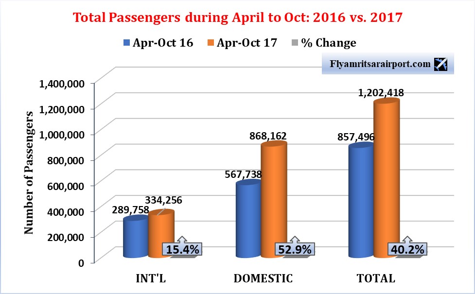 Despite no addition of international flights, number of international passengers during April-October 2017 has increased to 334,256 as against 289,758 during the corresponding period of previous year, thereby registering a double-digit growth of 15.4%. This rise in traffic shows that more people prefer to fly to Amritsar Airport.