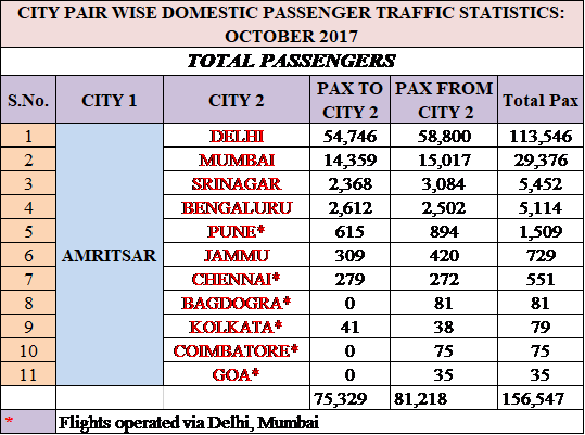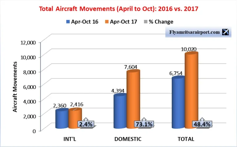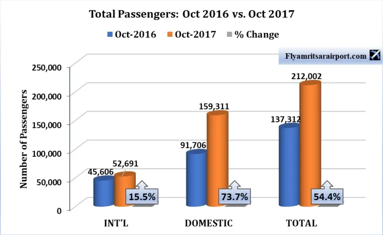 International passenger traffic also rose by 15.5% in October with 52,691 passengers, up from 45,606 a year earlier in Oct 2016. Even though, no new international flight has started from Amritsar Airport in 2017, this rise is due to the increase in passenger load on existing flights which shows that more travelers from the region are preferring Amritsar Airport instead of Delhi.