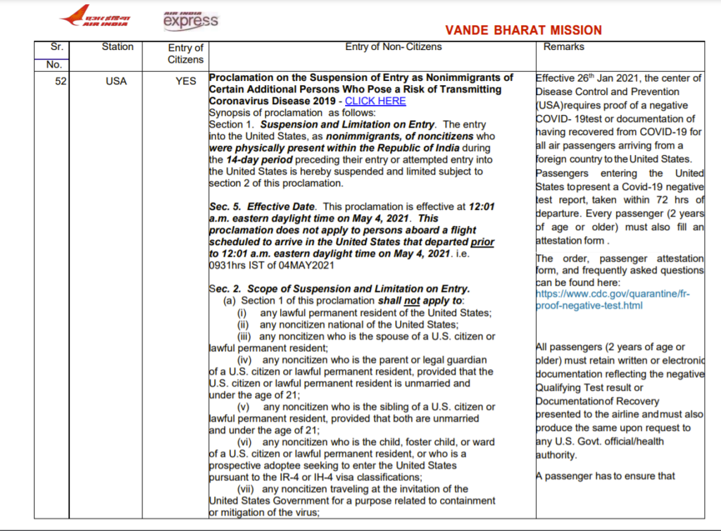 However, the airlines may reduce the frequency of its weekly flights between the two countries. Air India has issued revised travel guidelines for entry of Non-citizens for USA on its website. CLICK HERE